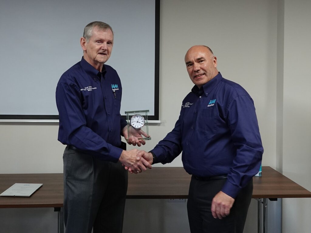 The photographs below are taken at the AGM and show Geoff being presented with a Certificate of Appreciation (from IAM RoadSmart) by our Treasurer Mike Price and myself, with the second photograph showing Geoff being presented with a clock as a gift from MWAM group members by Mike Price.